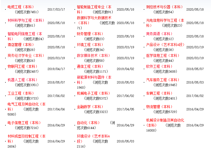 河南工学院是2016年经教育部批准升格为本科院校,更名为河南工学院。第一批本科专业招生一共有五个,分别是:机械设计制造及其自动化(080202)、材料成型及控制工程(080203)、电子信息工程(080701)、自动化(080801)和物流管理(120601)五个专业。至今已有32个本科专业,具体专业见下图: