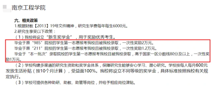 南京工程大学比较鼓励985和211的学生报考,在第一志愿的情况下,最多一次性可以获得20000元。调剂的学生可以得到每个月600元的生活补贴。