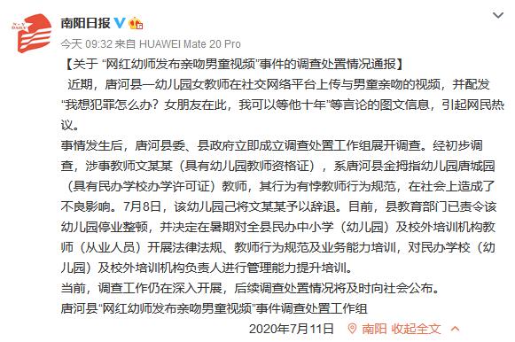 事情发生后,唐河县委、县政府立即成立调查处置工作组展开调查。经初步调查,涉事教师文某某(具有幼儿园教师资格证),系唐河县金拇指幼儿园唐城园(具有民办学校办学许可证)教师,其行为有悖教师行为规范,在社会上造成了不良影响。7月8日,该幼儿园己将文某某予以辞退。目前,县教育部门已责令该幼儿园停业整顿,并决定在暑期对全县民办中小学(幼儿园)及校外培训机构教师(从业人员)开展法律法规、教师行为规范及业务能力培训,对民办学校(幼儿园)及校外培训机构负责人进行管理能力提升培训。