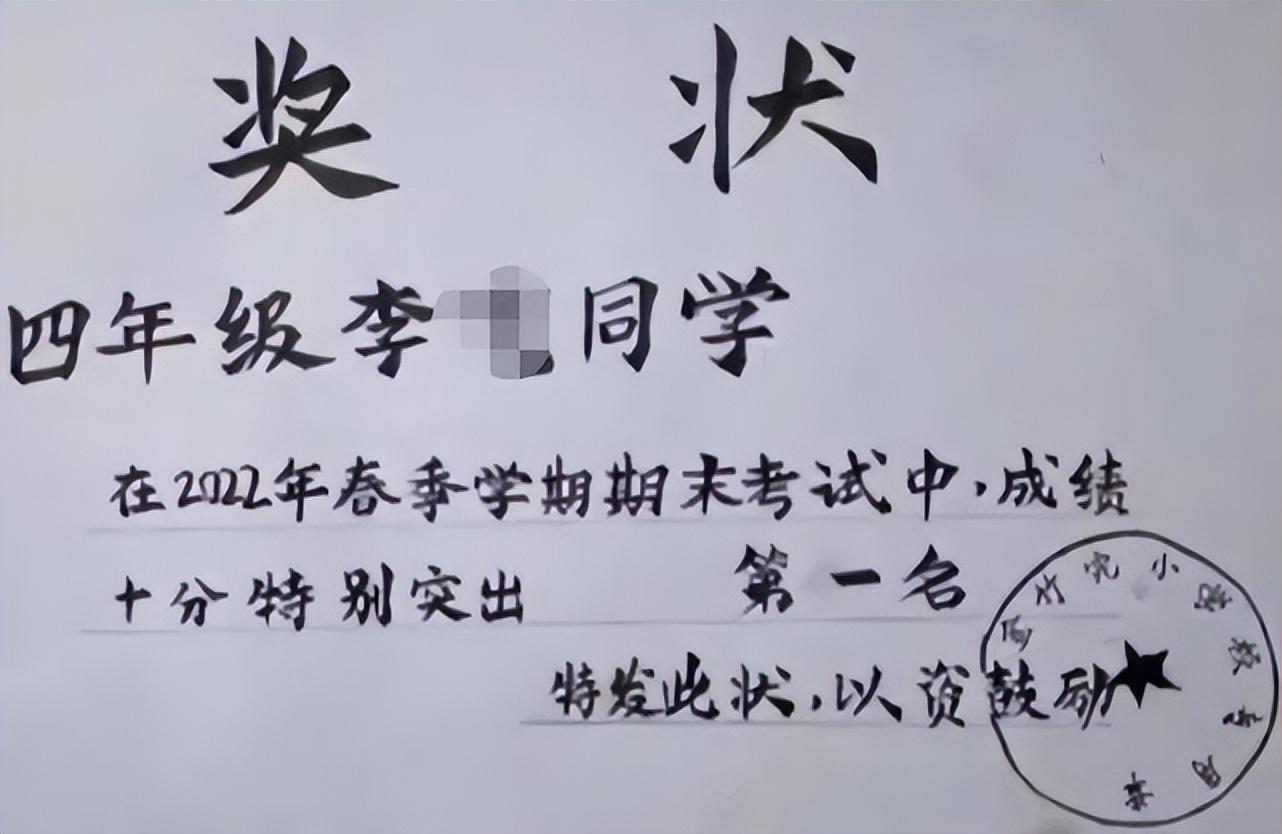 他怕家长不高兴批评他,便在临放学前,拿出一张A4纸,照着同学的奖状亲手画了一个奖状,把上面填上自己的名字,还写成期末考试第一名。包括细节之处,右下角的学校公章也一字不少,可谓力求完美。