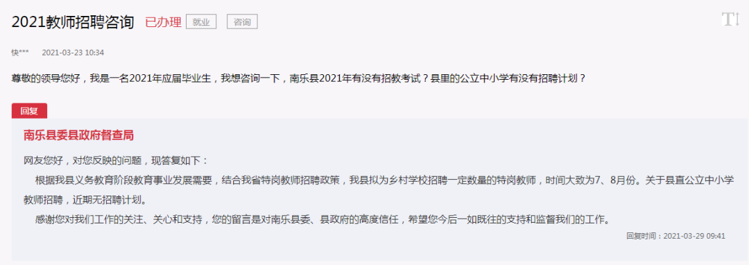 网友您好,对您反映的问题,现答复如下:根据我县义务教育阶段教育事业发展需要,结合我省特岗教师招聘政策,我县拟为乡村学校招聘一定数量的特岗教师,时间大致为7、8月份。关于县直公立中小学教师招聘,近期无招聘计划。感谢您对我们工作的关注、关心和支持,您的留言是对南乐县委、县政府的高度信任,希望您今后一如既往的支持和监督我们的工作。