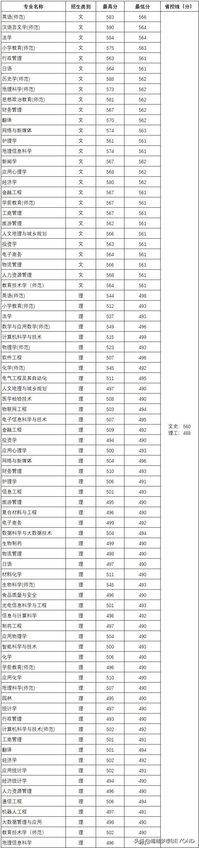 除了艺体类专业以外,阜阳师范大学普通类专业2021年均在安徽省本科第一批录取,还有部分专业在地方专项计划批次录取(省控线:文史类560分、理工类488分)。