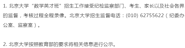 “数学英才班”招生工作在北京大学招生委员会的领导下,由北京大学招生办公室负责具体组织实施。