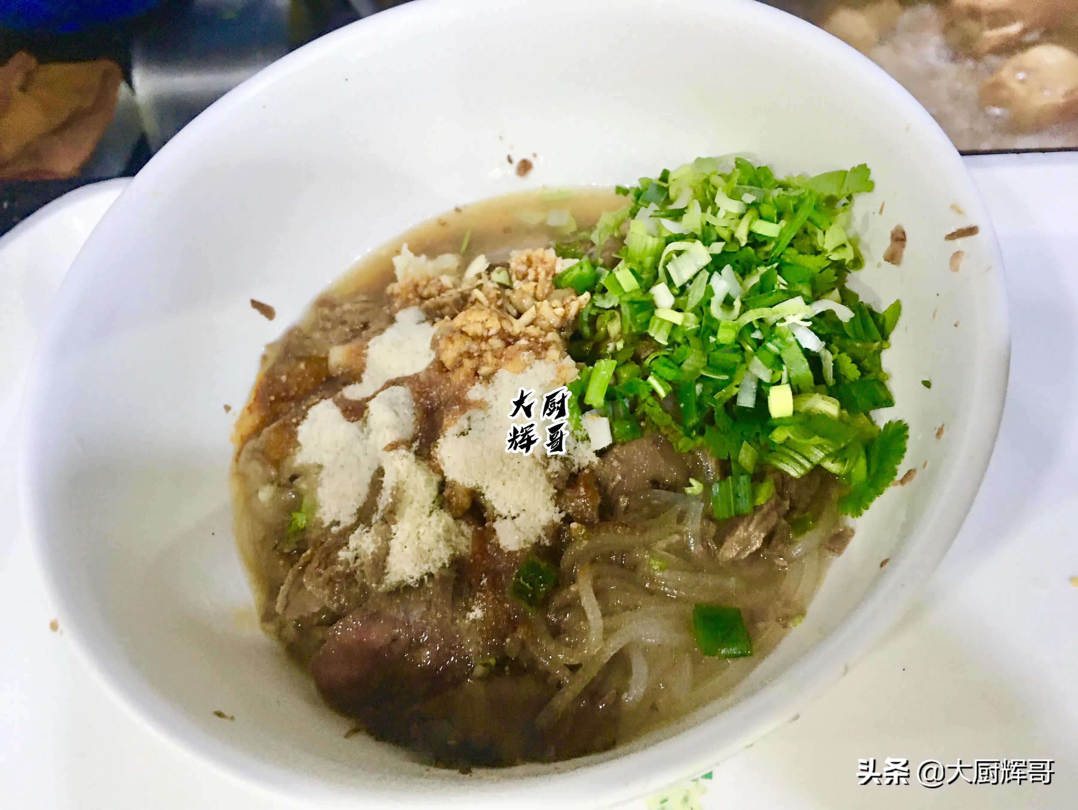 牛肉是上秤称的,里面会垫上红薯粉条,甩到厨房的窗口,厨师会往碗里放入各种佐料,撒上蒜末和大把的香菜,把牛肉片放在漏勺里浸入牛肉汤中滚上一滚,看牛骨头都是酱油色,然后舀入汤碗里,再淋上一勺的热汤。