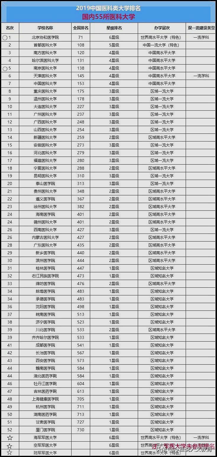 国内医科院校这几年发展很快,校友会针对独立办学的55所医科类院校,按照综合实力进行了排名,本次排名未将3所军医大学列入。