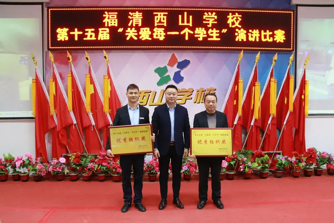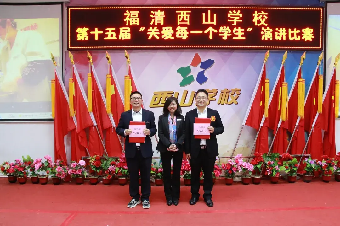 福清西山学校后勤处主任高原、招生办主任饶东辉、工会主席田舒心为荣获优秀奖的选手颁奖并合影