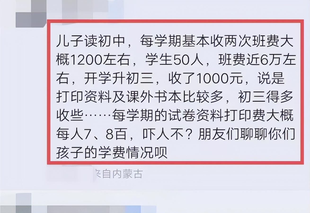 一位家长在网络上分享出儿子读初中的经历,初中阶段同学们也是属于义务教育阶段,但或许也是因为需要的花销比较多,所以班费的金额也就更多一些,但是在这位家长认为,基本上班费每名学生100元也就足够多了,但是没想到最终的金额让自己大吃一惊。
