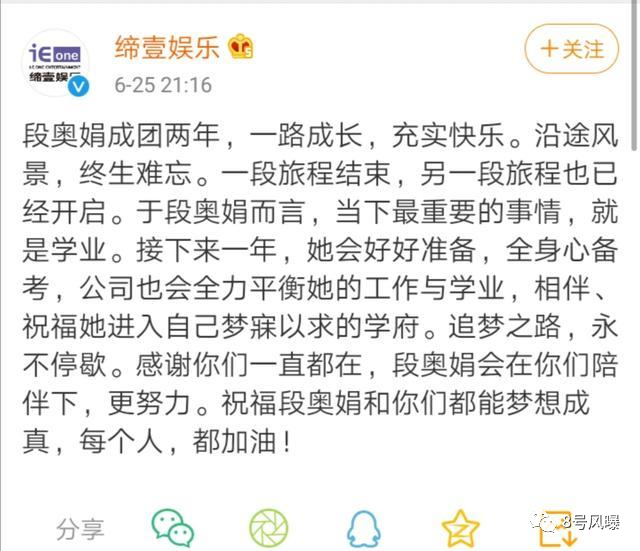 而2年来的大量行程,注定了她无法专注学业。这次始一解散,她所在的缔壹娱乐便宣布,接下来的一年段奥娟将全身心备考,继续追梦。