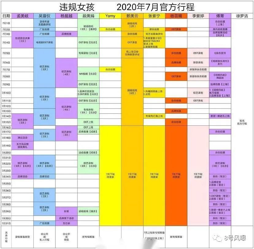网友所制作的火箭少女成员7月行程对比