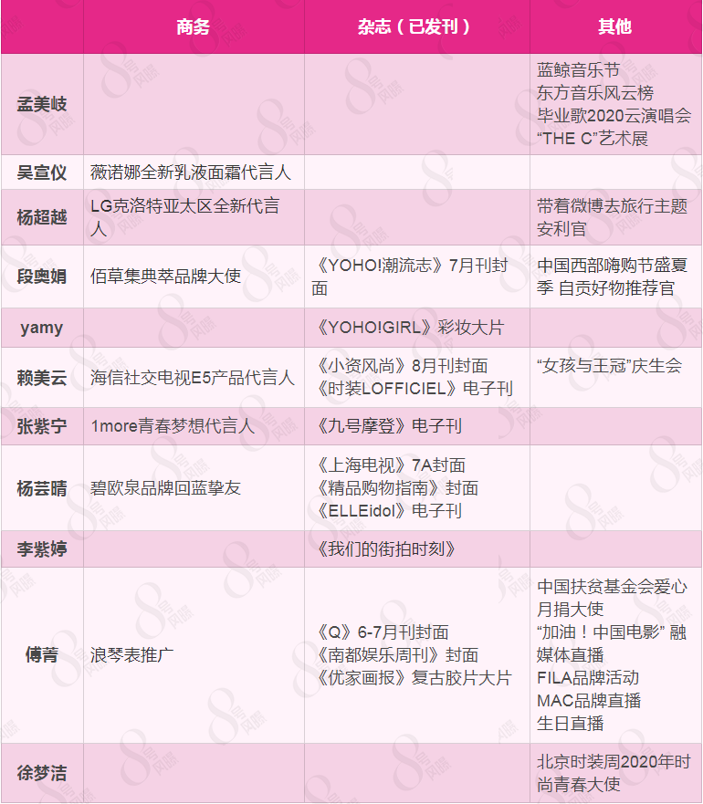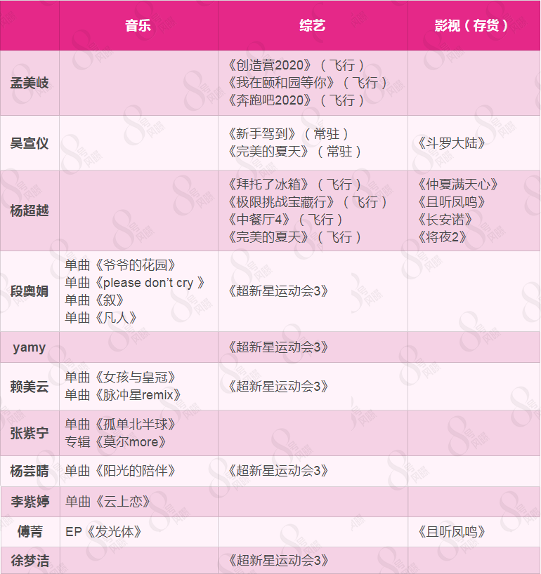 这一个月来,吴宣仪和杨超越则更多侧重综艺,前者一口气接下了两档新综艺的常驻嘉宾位置,后者在王牌综艺中任飞行嘉宾,如《中餐厅4》《极限挑战》等。