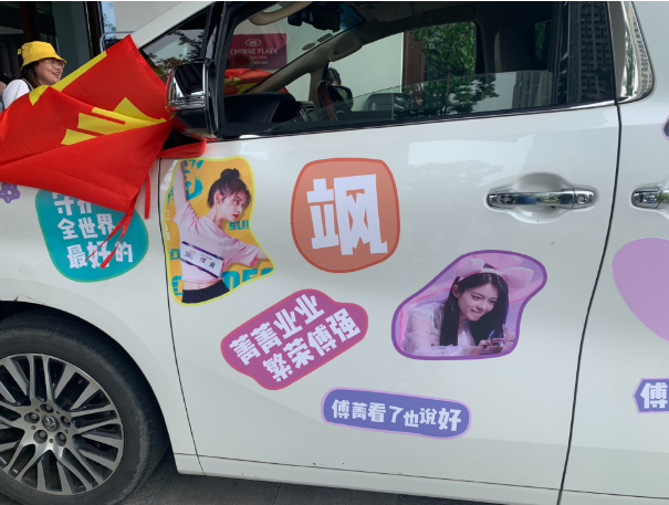 比如香蕉娱乐开来了贴满傅卡通贴纸的专车,“别骂了”几个字相当打眼,连安保人员都披上了“菁菁业业,繁荣傅强”的迎宾带。