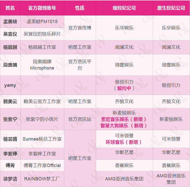 剩下的几位,杨超越、段奥娟、赖美云、李紫婷、付菁、徐梦洁均是回归原经纪公司,且部分成员先后成立了挂靠在公司下的个人工作室。