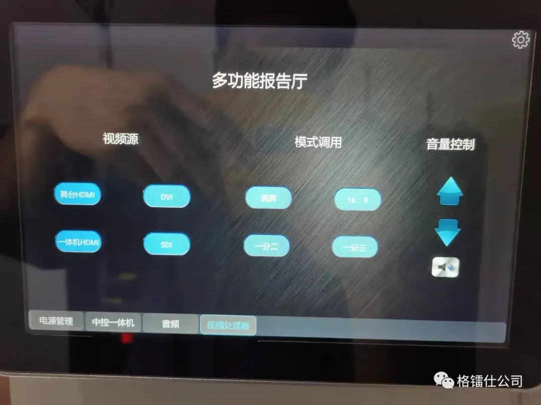 设1台智能化一体主机AV88M,音频处理,视频切换,智能控制全部由管理主机完成,使系统更加稳定,并且节省了设备空间和复杂的设备间连线;通过有线及无线屏控制音量、视频切换、音视频同步实时切换;环境周边设备控制、系统电源一键开关、一键模式切换。