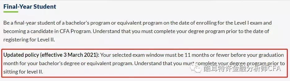 听说CFA协会报名条件更新了?是的,CFA协会宣布:自美国东部时间2021年3月3日(星期三)起,CFA一级考试报名要求将进行更新。目前协会是只调整了一条规定,即把“在报名时处于学士学位课程或同等项目学习的最后一个学年”,更新为:报名CFA一级考试时选择的考试窗口须处于学士学位课程或同等项目毕业月份前11个月(含)以内。(下图为官网的发布说明)
