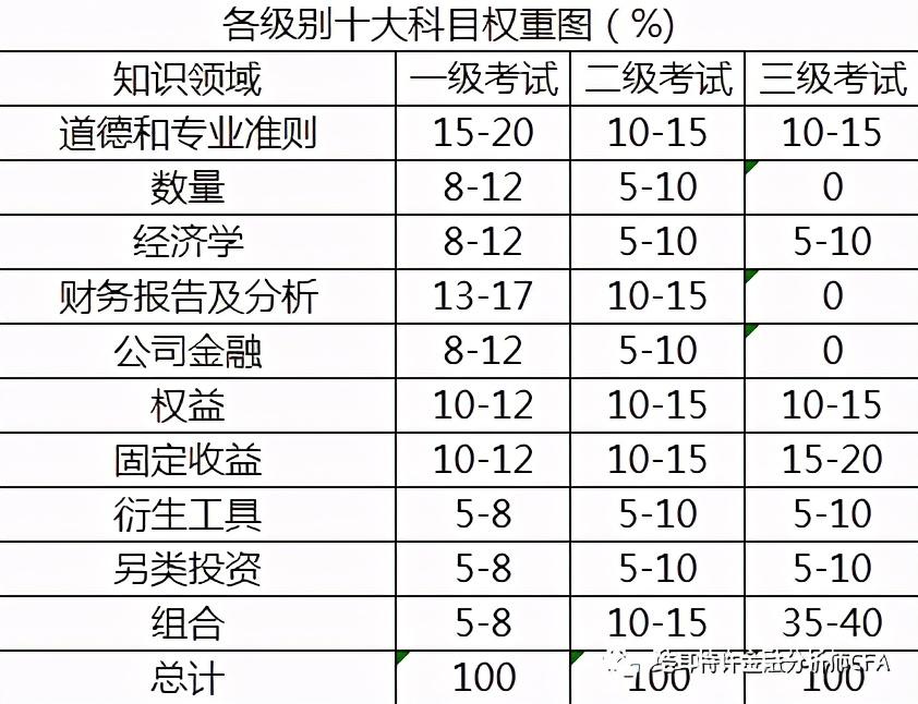 (1)CFA分为三个级别,每一个级别包含的内容都为十大科目的内容,考试科目为:职业伦理道德、数量、经济学、财务报告及分析、公司金融、固定收益投资、组合管理、权益投资、衍生品投资和另类投资。每个级别的难度都呈现剧增的过程,只有通过了前一个级别的考试才能进行下一个级别的考试。每一级考试的重点不同,只是难度要求随着CFA级数的增加递增,CFA考试每个级别的侧重方向也有所不同。下图为各级别十大科目权重图。