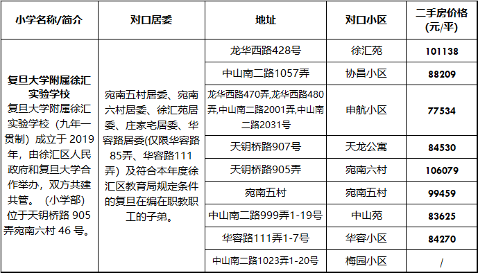 宛南五村居委、宛南六村居委、徐汇苑居委、庄家宅居委、华容路居委(仅限华容路 85 弄、华容路 111 弄)及符合本年度徐汇区教育局规定条件的复旦在编在职教职工的子弟。