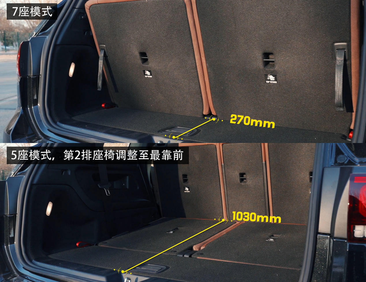 后背厢空间,7座模式下只有270毫米深度,只能放一些手提行李。5座模式下,只有把第二排调整到最前,深度才能勉强超过1米。