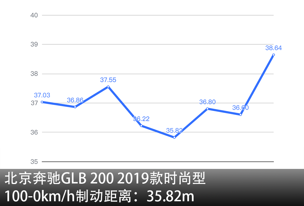 制动方面,GLB的表现就非常不错了,100公里/小时到0的最好制动距离为35.82米,连续8次制动的平均成绩也没有超过37米,没有热衰减或是刹车过热报警的情况发生,可以说刹车距离又短又稳定,这一点还是挺让人放心的。