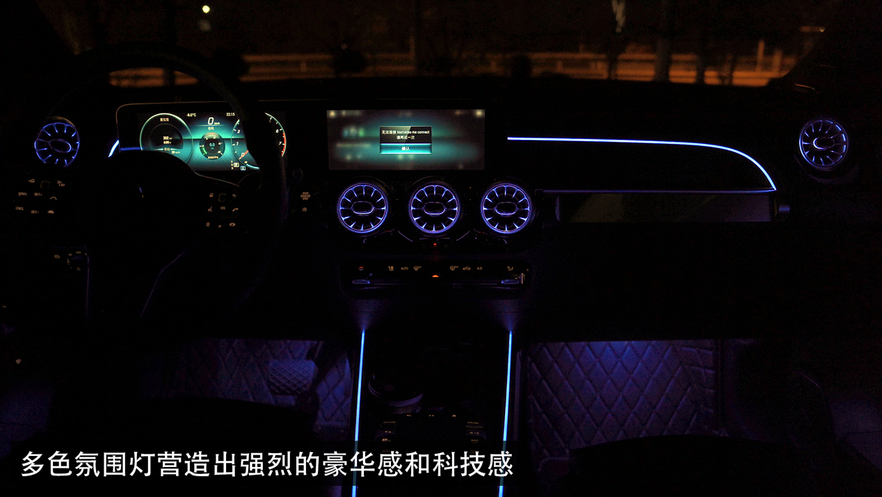 很多人喜欢这一批奔驰,都是被这一代家族化的内饰吸引了,GLB的内饰看起来非常漂亮,黑色亮漆与银色拉丝搭配显得非常高级,多色的氛围灯也是布满了各个角落,除了个别零件的塑料感外,整体给人的豪华感和科技感非常强。