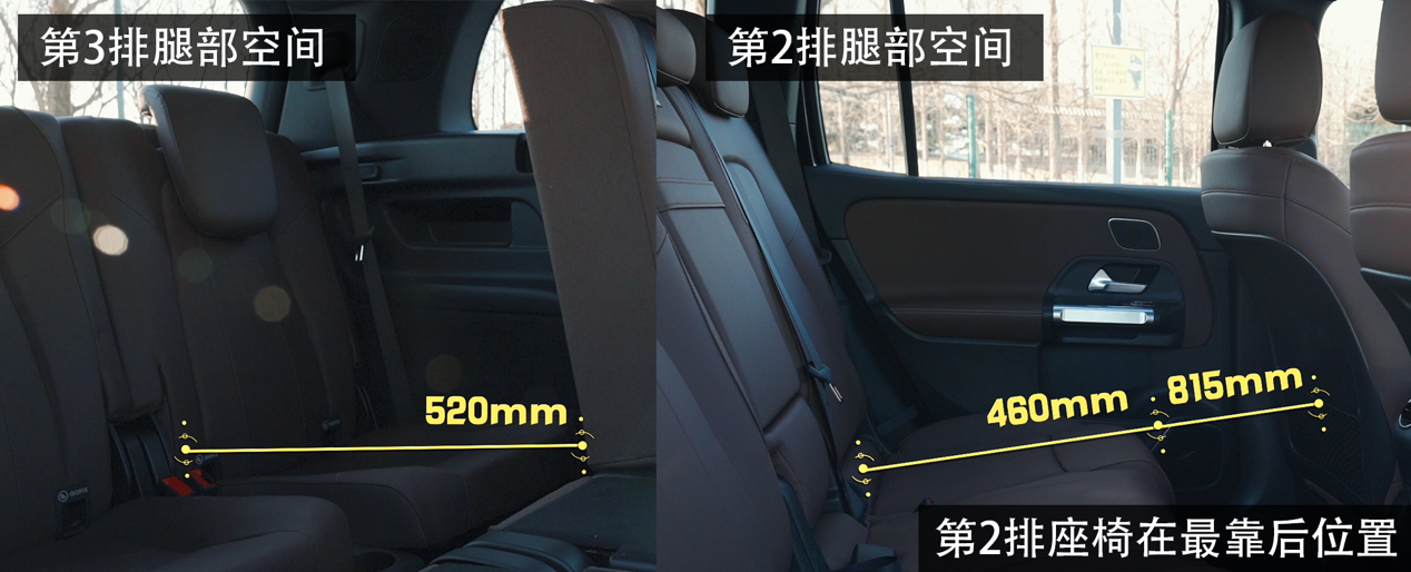 GLB的空间如果以一台5座车的标准去看,算是比较居中的水平,第二排最大腿部空间815毫米,座垫长度460毫米。但毕竟试驾车是一台7座车,在第二排座椅调整到最靠后时,第三排腿部空间只有520毫米,成人无法乘坐;第二排调整到最前时,第三排腿部空间650毫米,第二排675毫米,第三排勉强可以坐进成人。