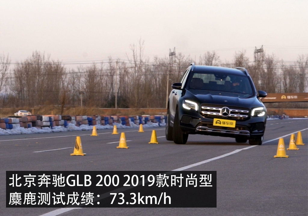 麋鹿测试是检验车辆紧急避障能力的测试,主要考验车辆的机械素质和电子稳定程序的表现。经过实测,GLB最快的入桩速度是73.3公里/小时,是一个比较正常的成绩,但需要说明的是这次使用的场地是在锐思,而不是我们经常用的八达岭机场,所以不能把GLB的成绩和其它八达岭测试的成绩直接相比。