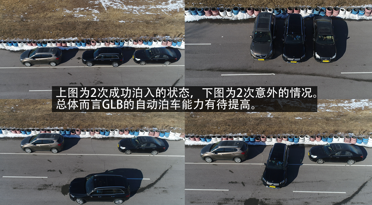 经过实测,GLB可以停进3米宽的倒库车位和8米长的侧方车位,表现一般。它的车位识别能力也很难令人满意,除了小车位识别不到外,在测试过程中还把侧方车位识别成了倒库车位,甚至在马路中间“凭空想象”了一个车位,直接停在了路中间,非常尴尬。并且它的停车技术也有待提高,前后挪车的次数过多。总结,希望厂家能升级软件改善这个功能。