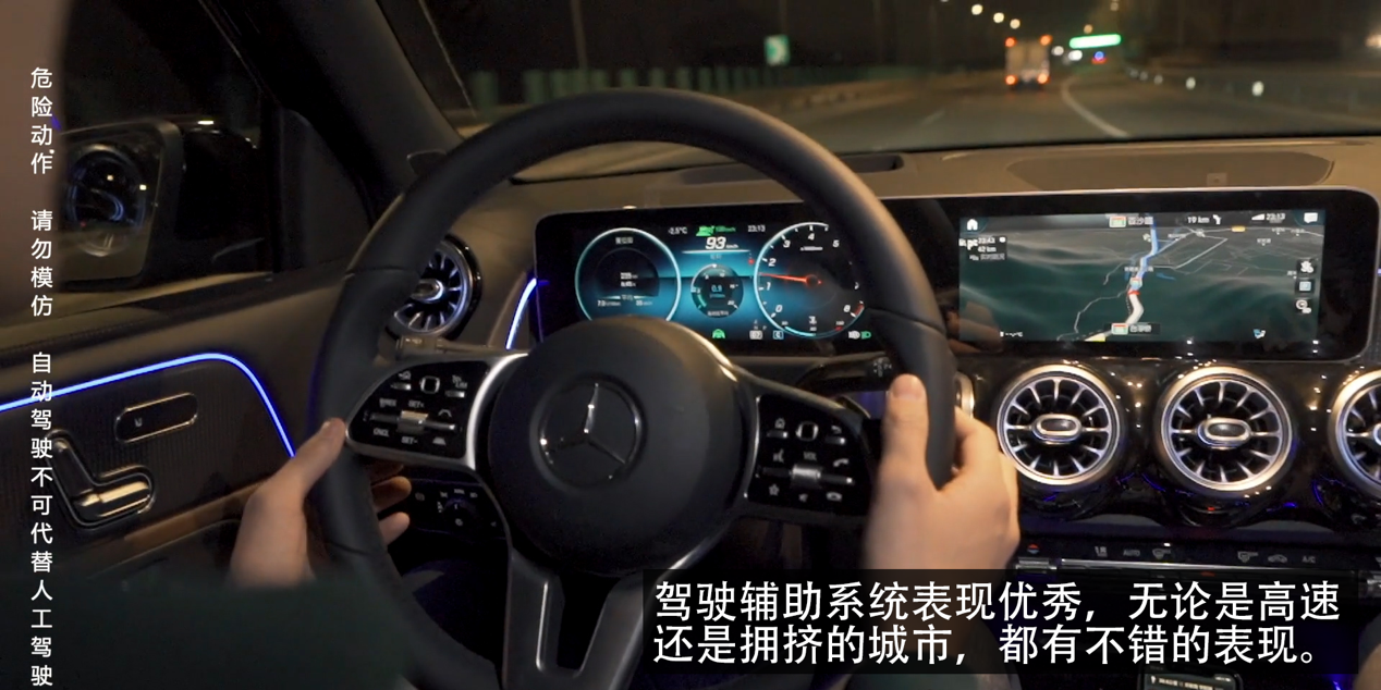 在实际路上体验上,GLB的表现可以说非常好。车道保持功能对车道线的识别率很高,并且可以将车稳定在车道中间,打方向的力度很连贯。在识别不到车道线或者前方有车的时候,GLB具备跟车的能力,跟随前车的轨迹行驶,例如在经过路口,或者一个车道分成两个车道的时候,这个功能都会发挥作用。另外还有一个彩蛋,GLB的的驾驶辅助和导航是联动的时候,当需要转弯时GLB的自适应巡航会自动减速,在道路环境和周围车辆允许额情况下,路口转弯也可以不用退出驾驶辅助,这还真是个黑科技。
