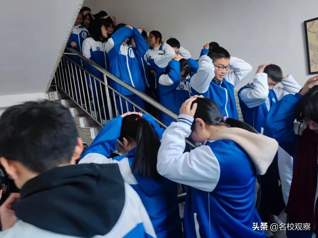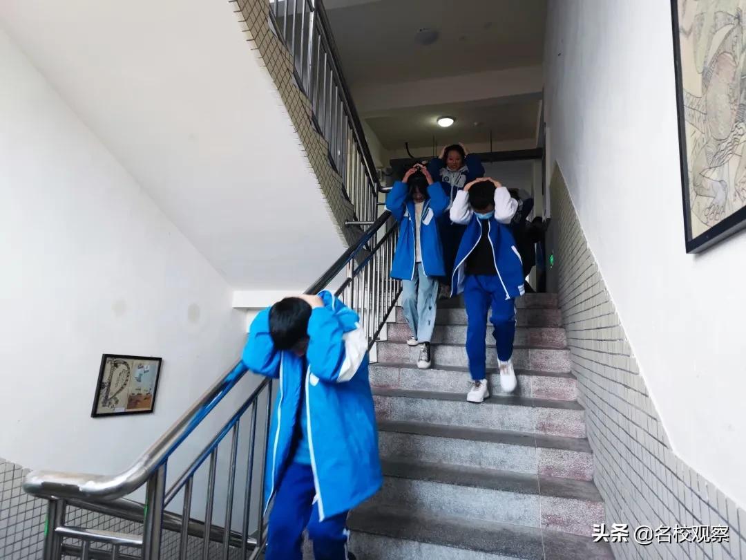 学生们双手护头,按指定路线迅速向安全区域撤离。