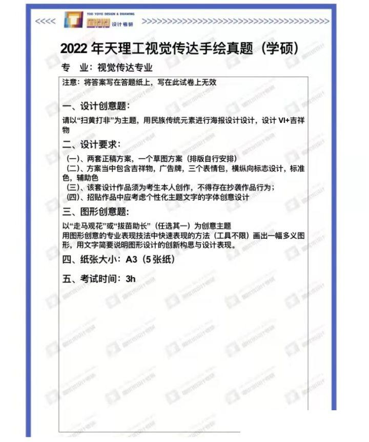题目的设计内容,明确的进行标注,考察内容比较广泛,但同学们一定要注意,我们考试主题是针对,“打黄打非”为主题进行设计,在围绕主题进行招贴广告设计的同时,还要注意个性化的字体创意设计和标志创新设计,所以同学们针对,字体、标志和图形以及版式设计,突出主题内涵特点,并呈现在快题中,将是很大的亮点。明确了考试要点与设计的大方向,再针对主题进行具体的设计。1.天津理工大学设计考研专业课部分近几年是比较稳定的,并没有太多的改革,不管是考试内容,考试时间,考试题型,参考书等等。都没有明显的变化,所以对于考生来说是比较容易高效针对性准备的,由于学校突然更改参考书或者考试题型,而导致考生来不及去准备的情况基本不会出现。