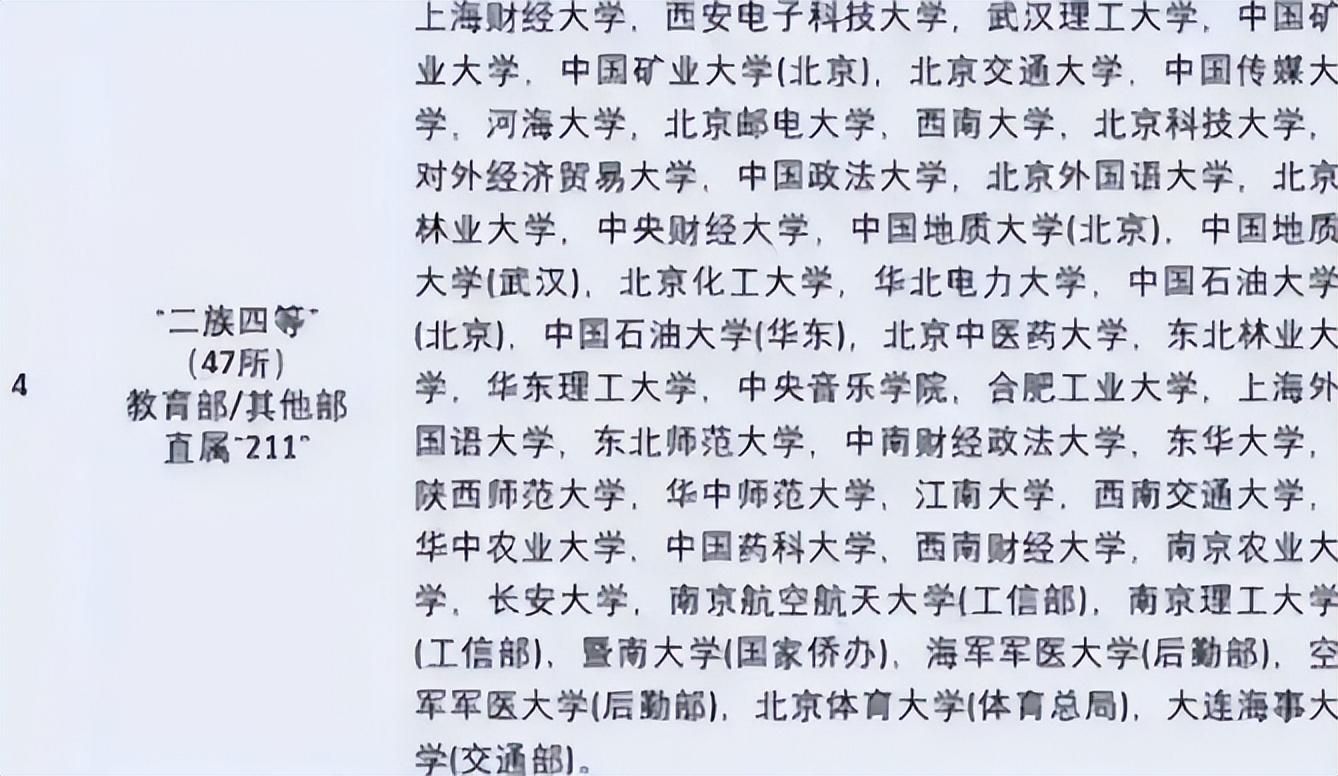到了第四档,轮到了47所211大学了。因为211大学和985大学,会在一定时限内进行审核工作,如果达不到相关要求的学校,就需要马上整改。要是符合相关要求,就可以加入211/985大学的队伍。