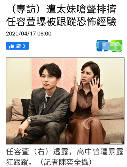 任容萱则透露,高中时期某天放学独自回家觉得背后有人尾随,对方没有现身也把她吓出一身冷汗,当时回到家拿钥匙开门的手都在发抖。