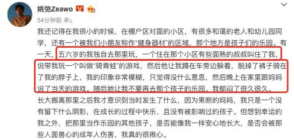 前段时间男偶像姚弛,在自己社交平台上勇敢发声,讲述自己小时候的黑暗经历,当时他只有五六岁,一个人在小区里玩,突然来了一个面熟的叔叔,要和他玩骑青蛙的游戏,脱了裤子骑在他脖子上。