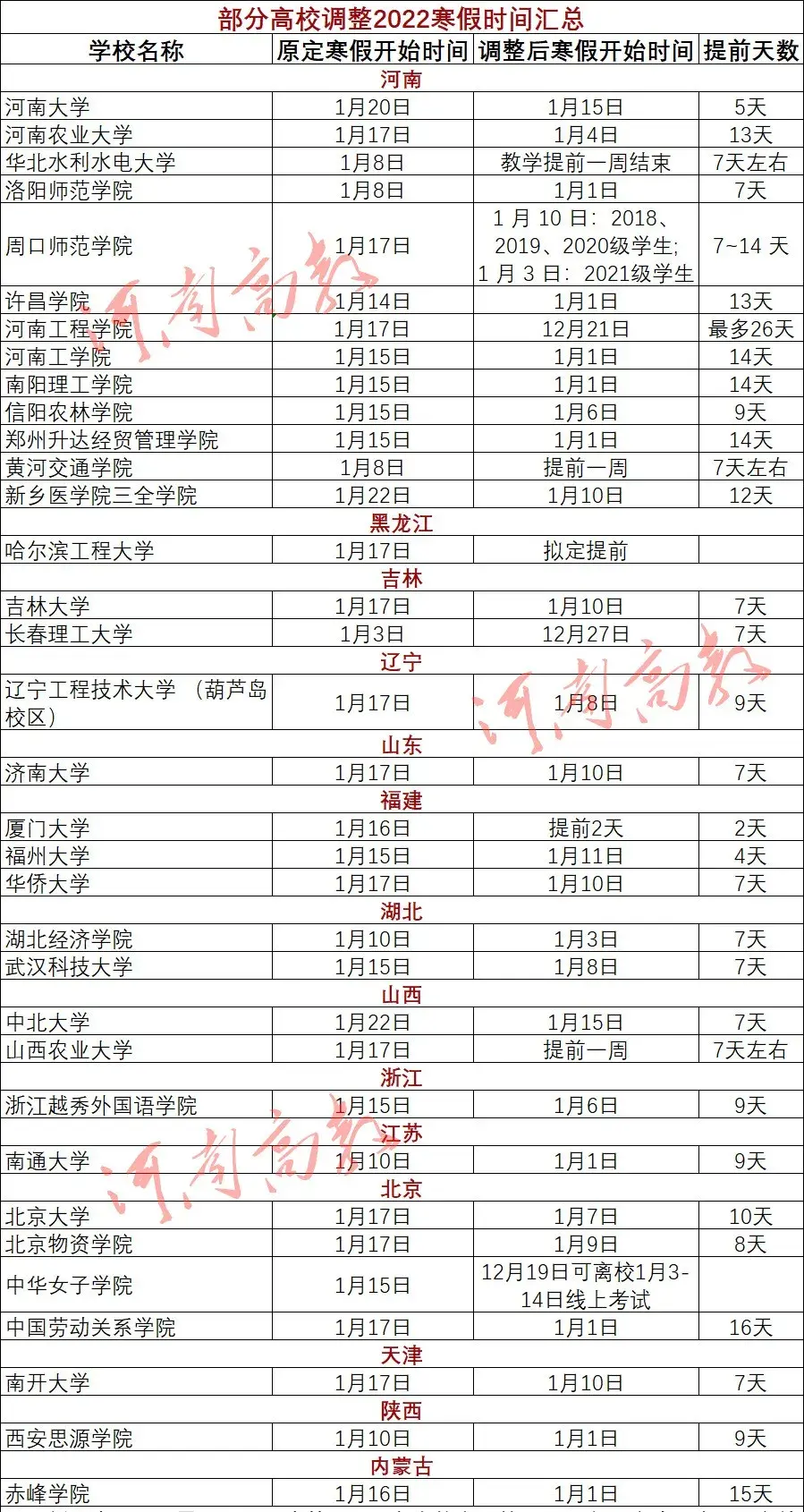 近期通知调整寒假时间的高校如下: