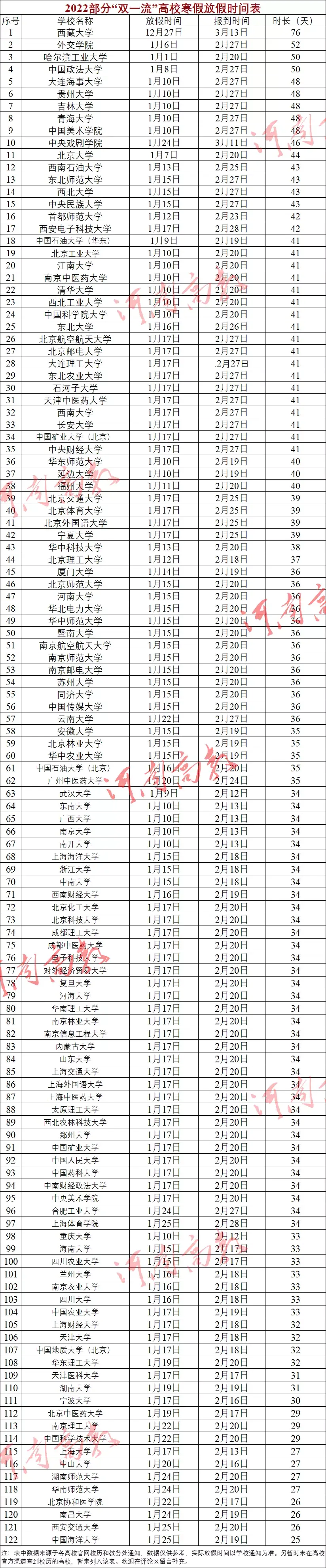 (本表仅统计“双一流”高校的寒假时长,后续将继续汇总更多高校相关信息,敬请关注!欢迎大家留言补充。)