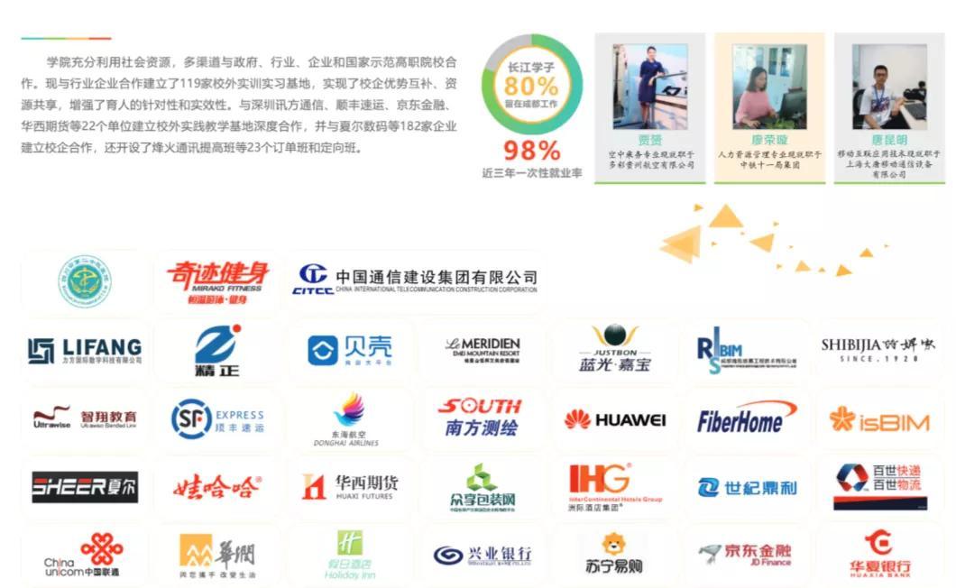 四川长江职业学院以就业为导向,利用成都东三环地铁旁的地理优势,以现代职业教育理念改革人才培养模式,广泛开展校企合作、工学结合,依托“大学生香港行”项目促进人才培养;倡导和鼓励学生以工学交替、半工半读、现代师徒制、订单培养、教学见习、顶岗实习等多种形式加强职业能力培养,增强学生实践动手和创业创新能力,实现实训-实习-毕业-就业无缝对接。