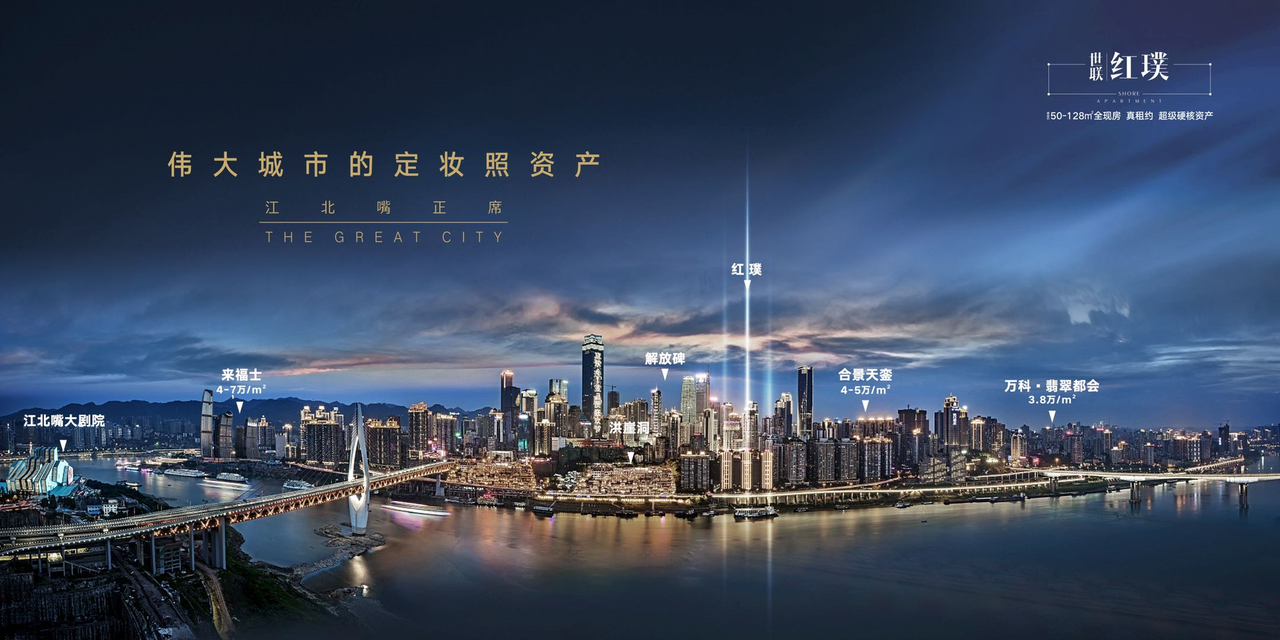 最核心位置:渝中区解放碑,区域内2年内无地块供应,两江四岸政府暂停开发最好的地段:背靠解放碑;楼下洪崖洞;对望江北嘴,比肩来福士最成熟配套:紧邻解放碑商圈,步行5分钟可达2号线临江门轻轨站,医疗教育配套齐全最炫的江景:一线对望政府耗资6800万打造的江北嘴金融中心灯光秀,重庆最美江岸线尽收眼底楼上解放碑,楼下洪崖洞