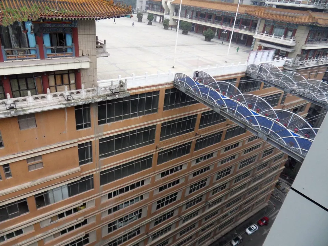 它,就是重庆最高的人行天桥:高盛创富中心天桥,高盛创富中心B栋22楼和奎星楼广场之间,该廊桥身长约23米,高约68.5米,桥面宽4米,实际通行宽度3.6米。