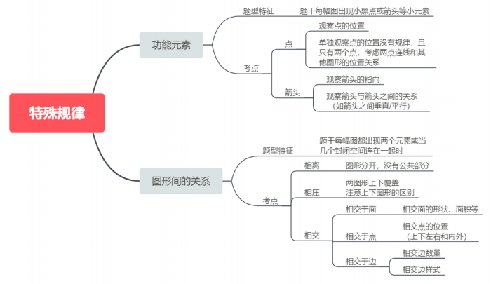特殊图形规律包括带有方向的箭头,黑色小圆点,图形开口,图形起始点方向和图形间的关系比如相交、相切、相离等。