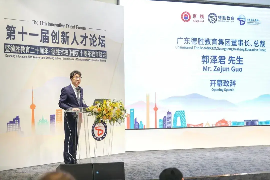 论坛上,广东德胜教育集团董事长、总裁郭泽君发表了开幕致辞。郭泽君探讨了创新对于国家、社会的重要意义,并指出,实现创新需要每一位教育工作者的共同努力,更需要每一位教育工作者拥有创新精神,学校要不断发现、鼓励老师进行创新,用优秀的人培养更优秀的人。