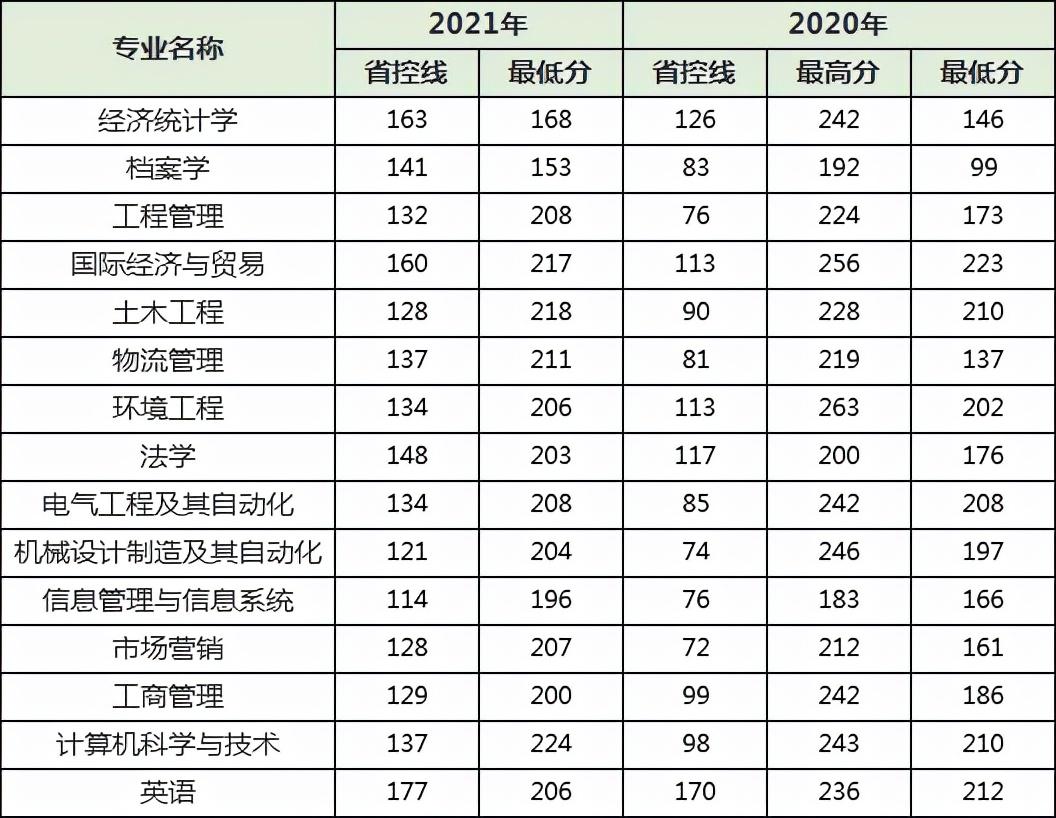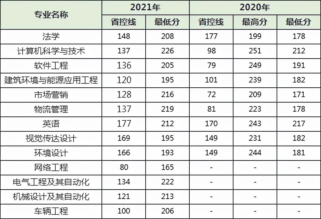 关于郑州轻工业大学分数线涨幅,就省控线上分析:除了法学专业有所下降,其余专业比2020年均有提高,其中计算机科学与技术、软件工程、物流管理、市场营销,涨幅基本都在50分左右。其中英语专业涨幅较小,比2020年只上涨7分。就各专业录取最低分上分析:与2020年相比,除了英语专业有所下降,其余均有所上升。其中市场营销、物流管理专业录取最低分数线上升较多。