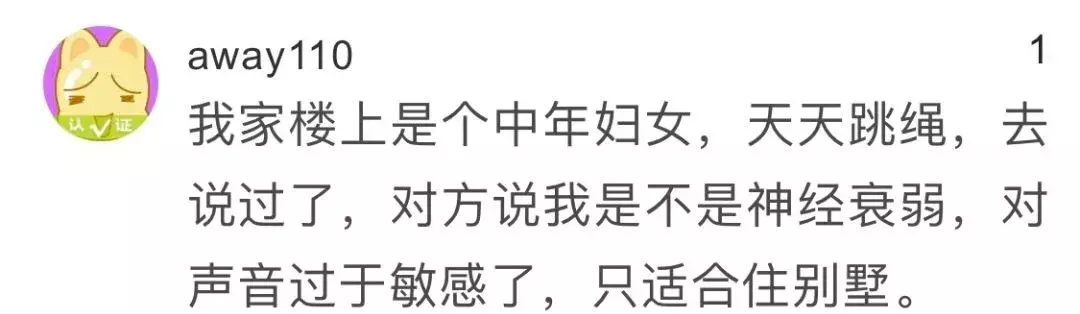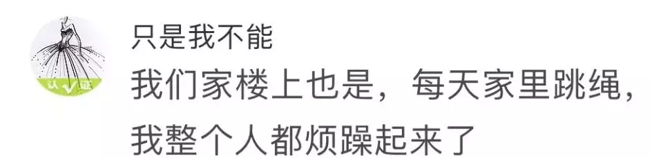 住在我家楼上的小孩每天晚上大概八点开始就在家里面跳绳,时间持续两三分钟左右。我听着真的很难受啊!砰砰砰砰砰砰,我们家孩子因为怕影响别人都是带绳子去楼下跳的。真不知道这家人是怎么想的……我住的是10年的小区,两梯两户,电梯口的过道足够跳绳拍球。另外还有一个公共阳台也可以跳绳,而且走廊带门,雨淋不到,风吹不到,不想下楼的话也能在那里运动。而且,我们小区大部分有小孩的家庭,小孩都是在电梯口跳绳的。可是,我家楼上住着的就是喜欢在家里跳绳,不愿意开门在门口跳。此帖一出,引来了很多网友的围观,不少人直呼自己也遇到了和楼主一样的情况。