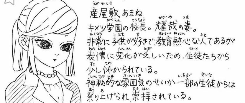 产屋敷天音是鬼灭学园校长产屋敷耀哉的妻子,她非常喜爱孩子并对教育抱有极大的热情。