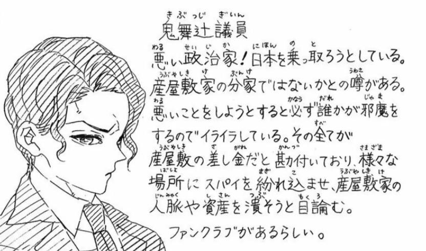 产屋敷耀哉和其他鬼灭学园出身的政治家们一起,同鬼舞辻议员对抗着。