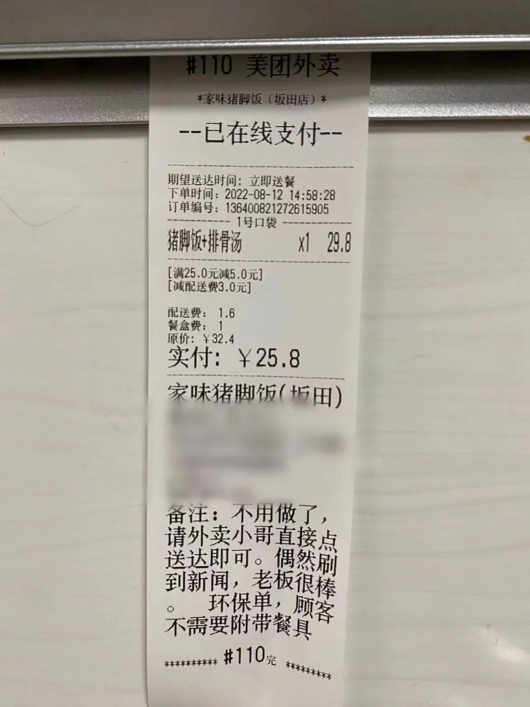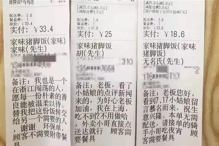 “(外卖)不用做,请外卖小哥直接点送达即可。偶然刷到新闻,老板很棒。”“此单直接送给骑手小哥”……备注里,顾客写下了这些需求。