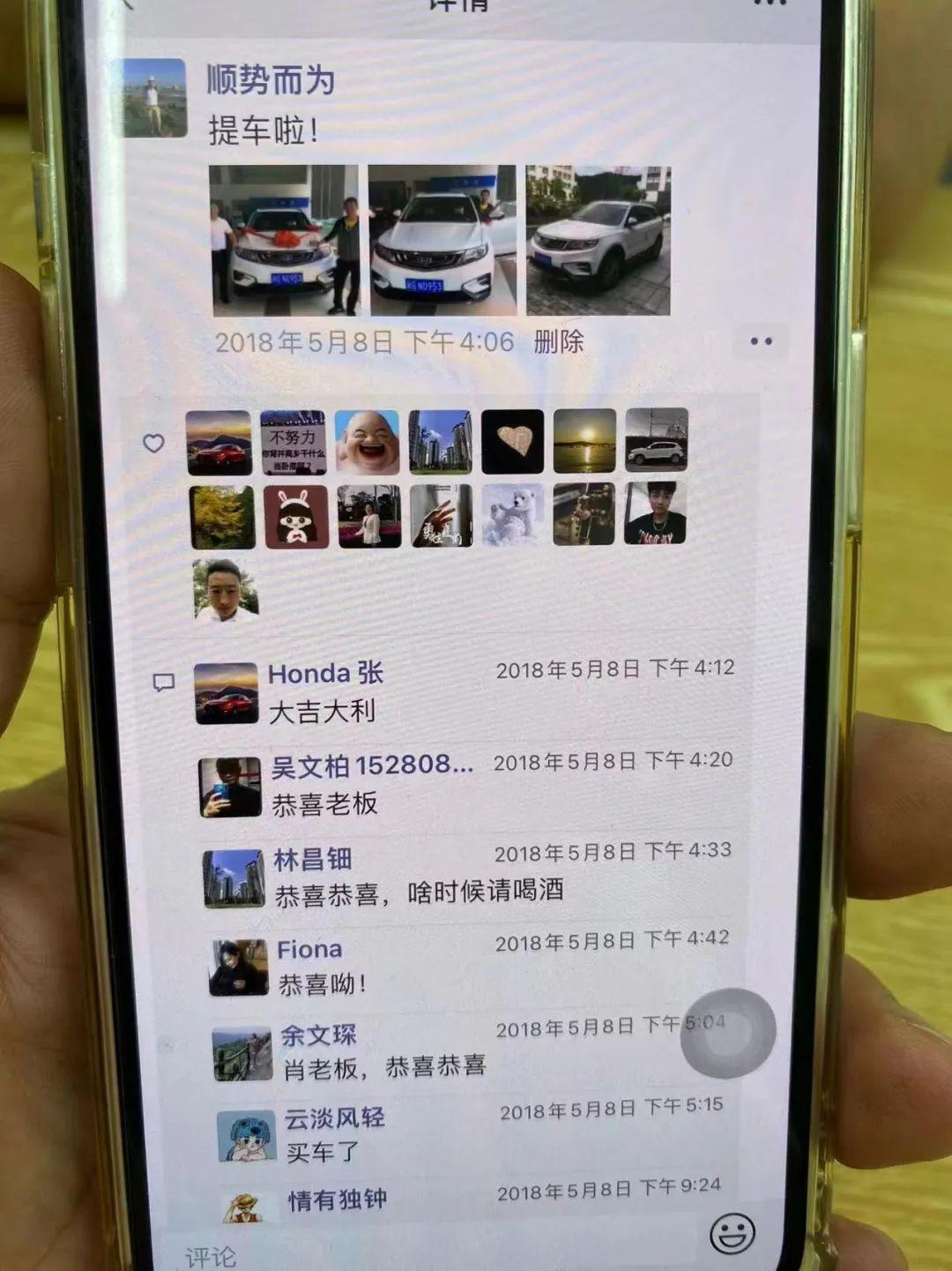 2018年5月8日,距离他年满28周岁还有2个多月时,他给自己买了人生的第一部车,那是一部白色的小车。提车那天,他拍了不少车的照片,并发了“提车啦!”的朋友圈。