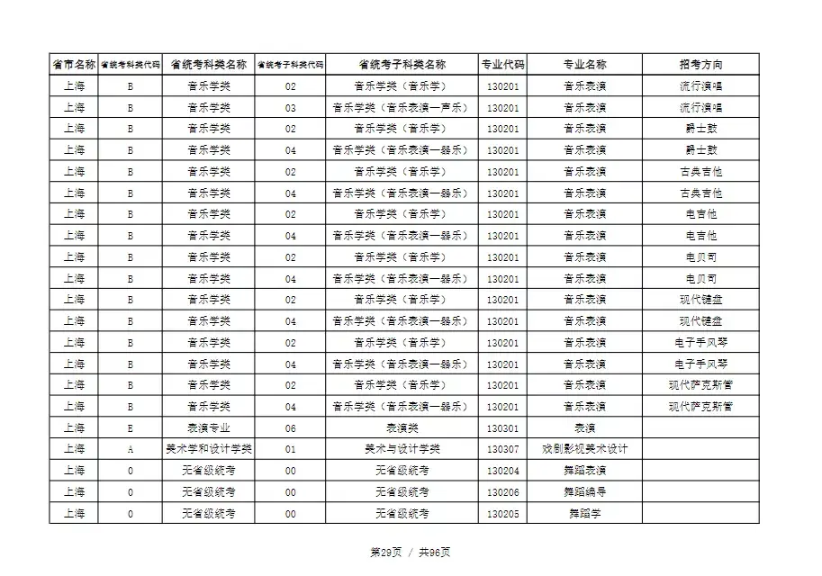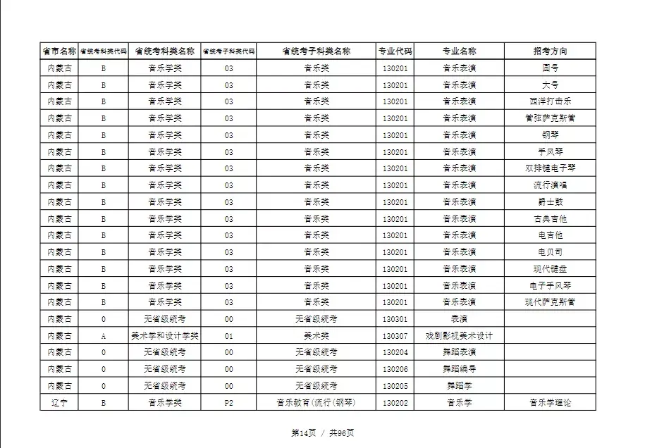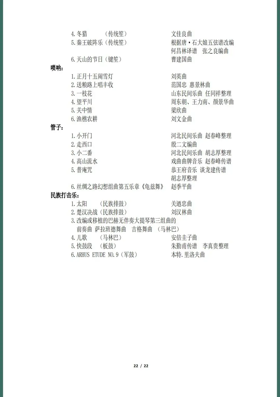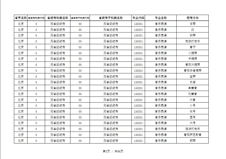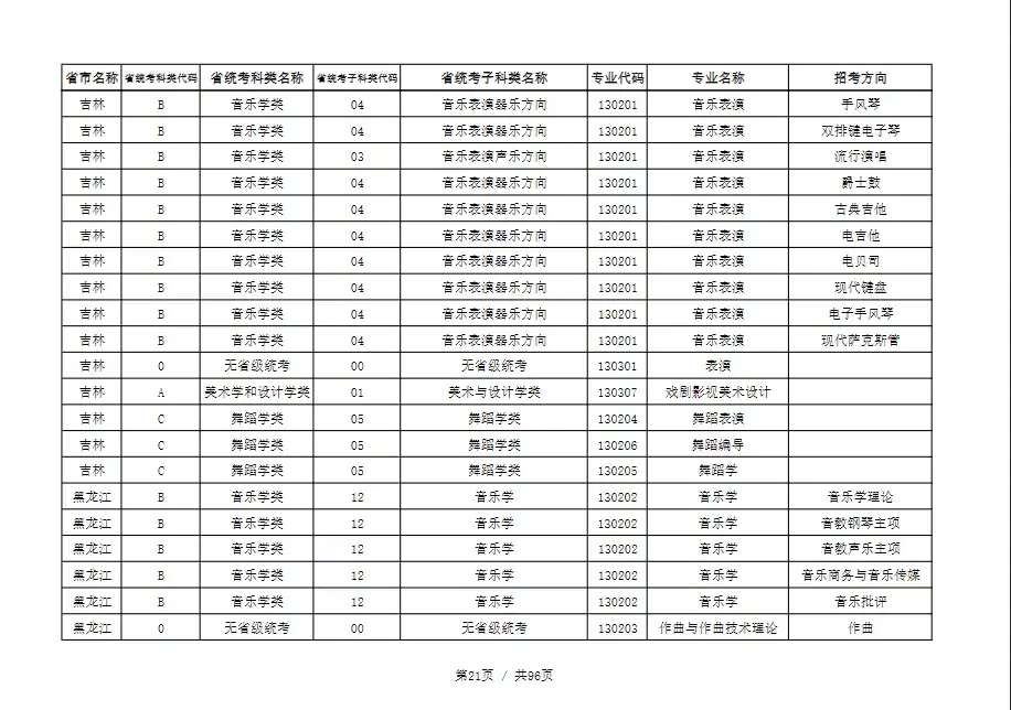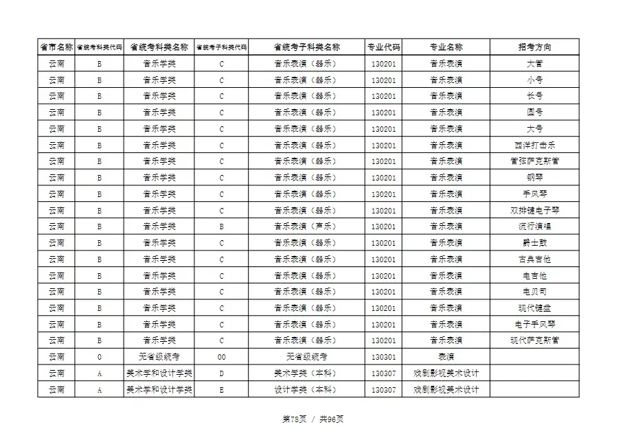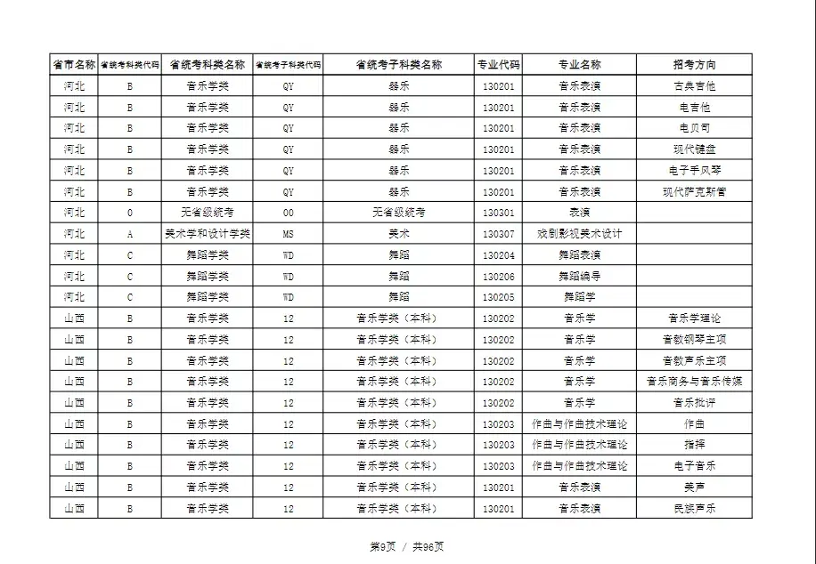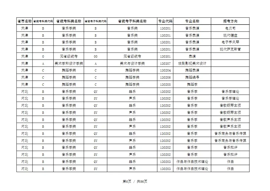天津音乐学院2022年校考专业与各省统考子科类对照表