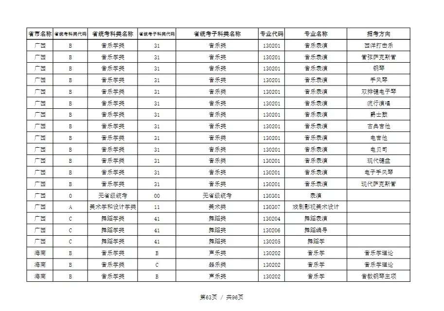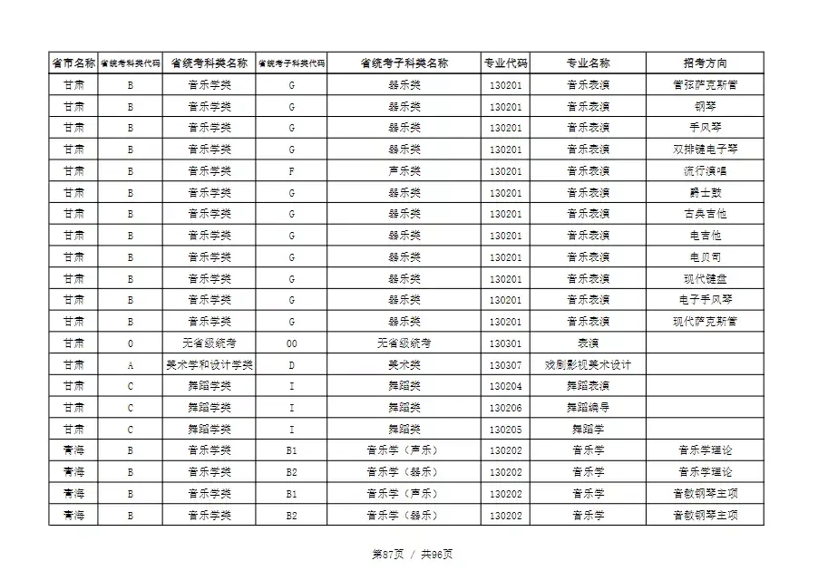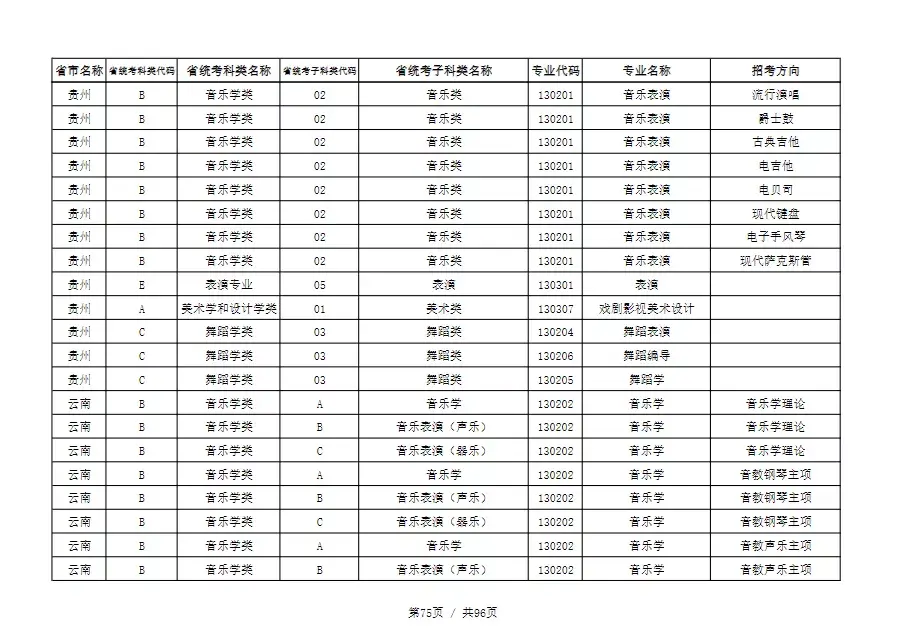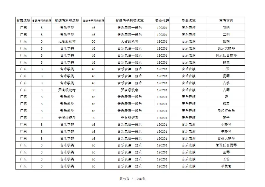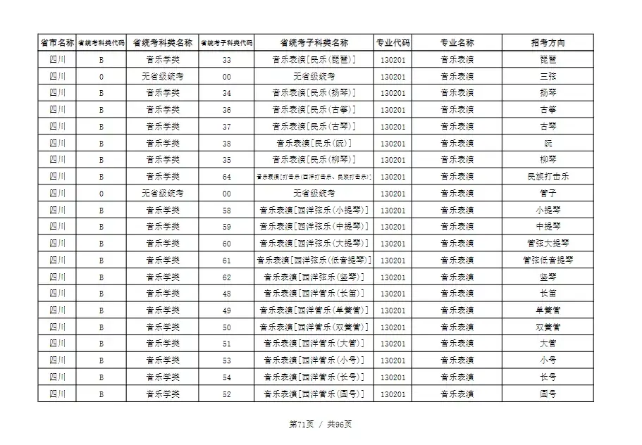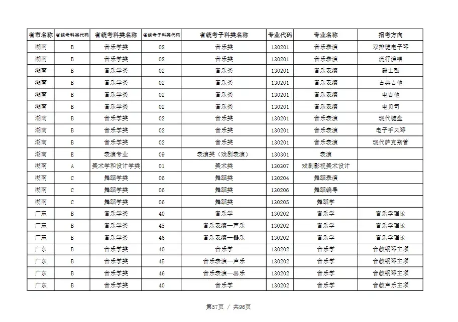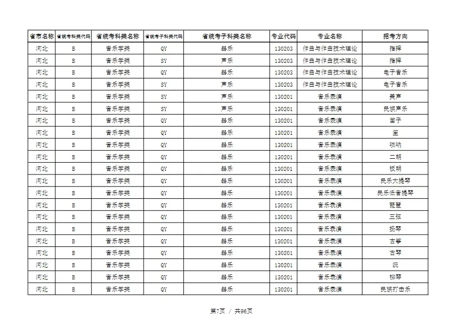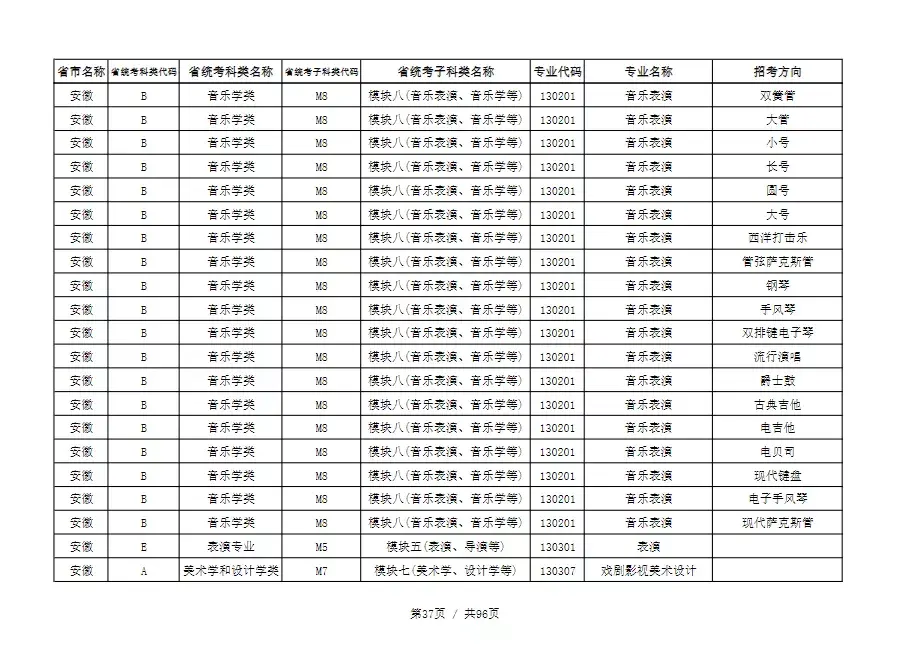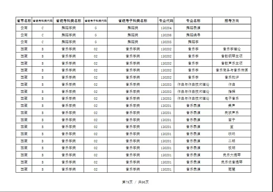 天津音乐学院2022年校考专业与各省统考子科类对照表