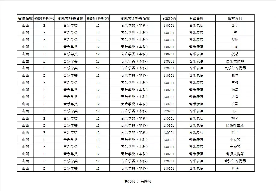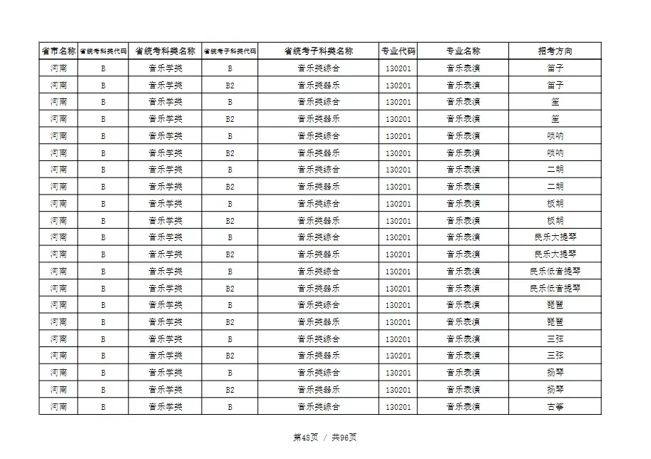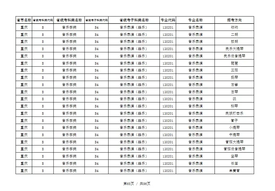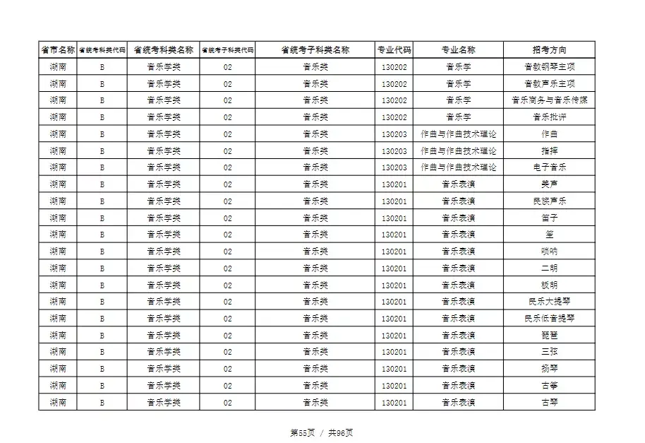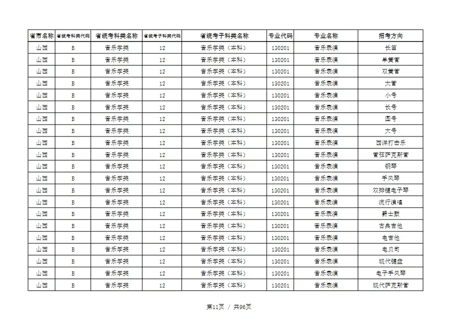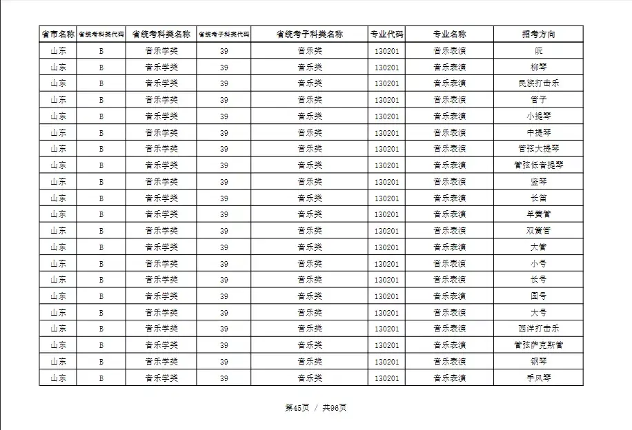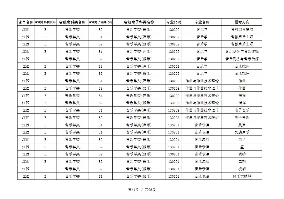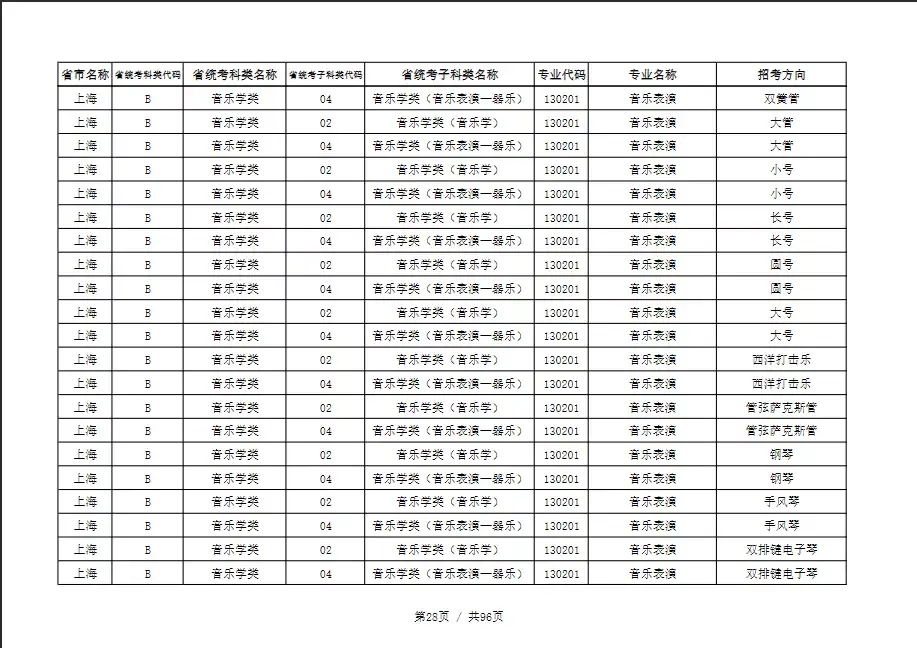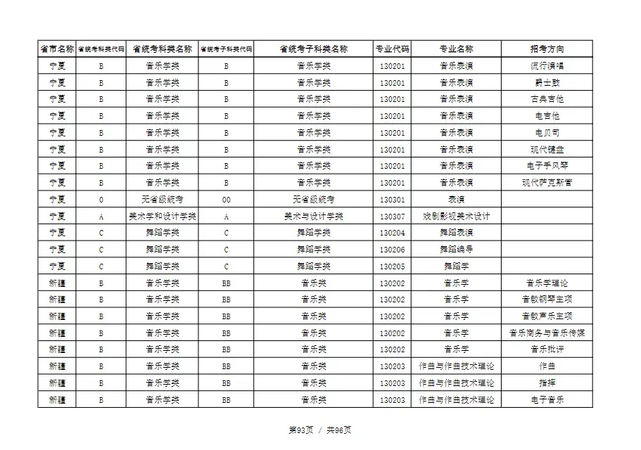 天津音乐学院2022年校考专业与各省统考子科类对照表