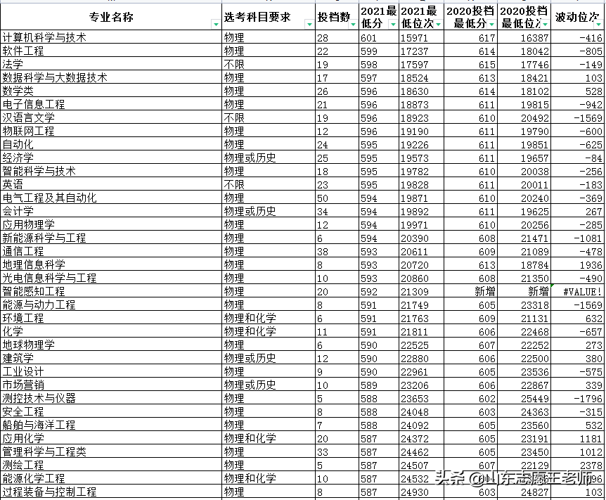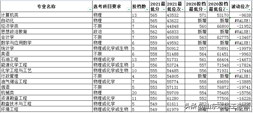 2、中国石油大学北京校区共计有22个专业在山东省招生,最高分也是计算机专业,最低分是地质类的专业,具体情况如下: