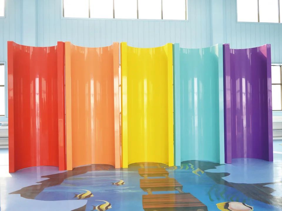 此外他认为,为客人带来明亮多彩体验的创新玻璃钢技术也将继续呈上升趋势。如白水研发的有丰富色彩和图案选择的透明彩带玻璃钢。以激光状条带为例——加装该设备的滑道开始时间较长,然后越来越短,从而带给游客科幻般的速度感。